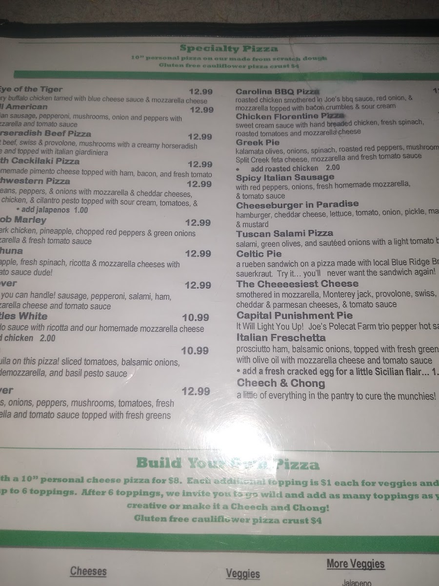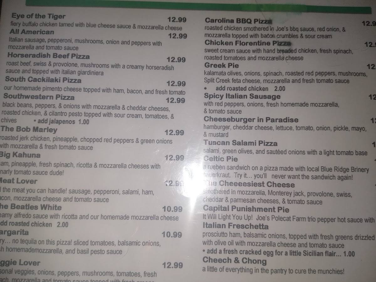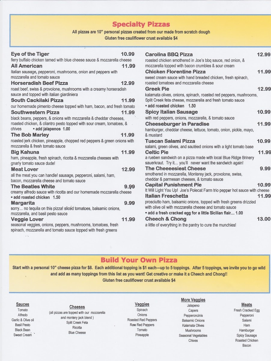 roasted chicken smothered in Joe's bbq sauce, red onion, & mozzarella topped with bacon crumbles & sour cream